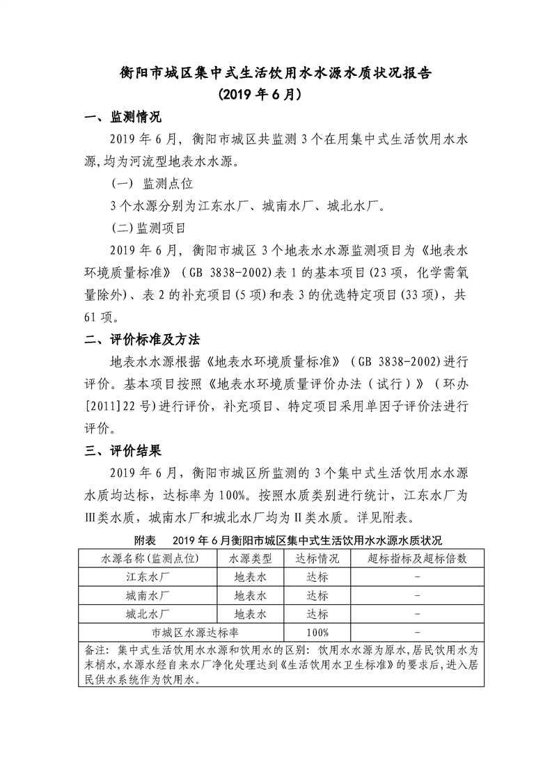 衡陽市城區(qū)集中式生活飲用水水源水質(zhì)狀況報告(2019年6月)